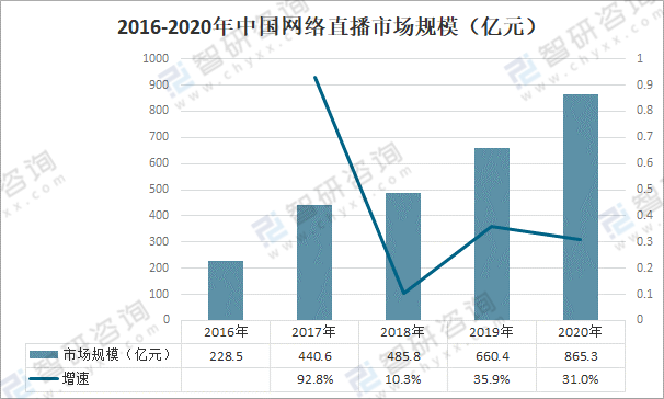 直播行業是近年來的新興行業,本質上說是一種社交形式,發展較為迅速。直播的優勢在于具有實時性,互動性強,與視頻相比更直接。直播變現較快,可以帶動其他行業發展,在商業價值方面很有潛力,能對視頻產生一定的替代作用,對互聯網視頻行業的威脅較大。2020年中國網絡直播市場規模達865.3億元,同比增長31.0%。