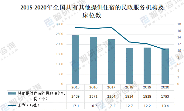 截至2020年底,全國共有其他提供住宿的民政服務機構1793個,較上年減少35個,同比下降1.91%;其他提供住宿的民政服務機構床位10.4萬張,較上年減少1.8萬張,同比下降14.75%。