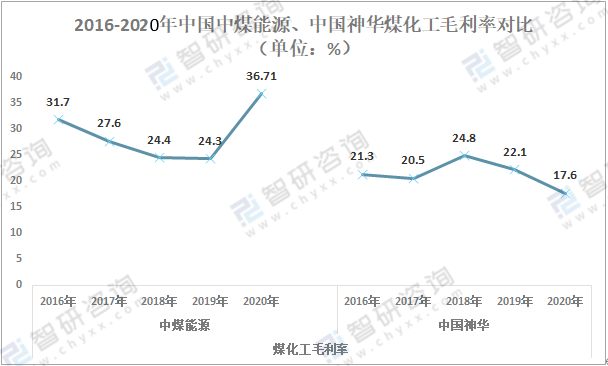2016-2020年中國中煤能源、中國神華煤化工毛利率對比