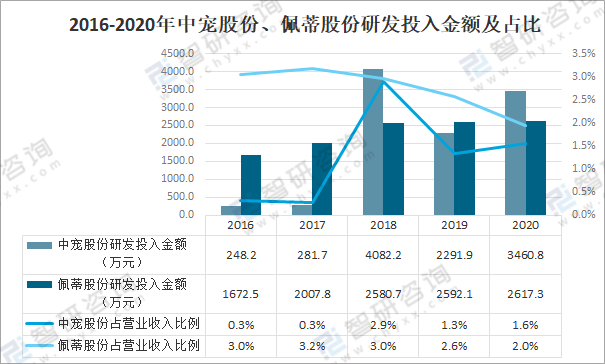 2020年中寵股份研發投入金額為3460.8萬元,占營業收入的1.6%;佩蒂股份研發投入金額為2617.3萬元,占營業收入的2%。