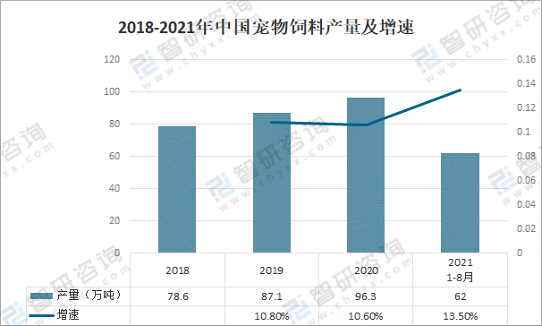 受益于犬、貓類寵物食品市場規模的不斷擴大,寵物食品行業的市場規模持續增長。2020年中國寵物飼料產量為96.3萬噸,同比增長10.6%;2021年1-8月中國寵物飼料產量為62萬噸,同比增長13.5%。