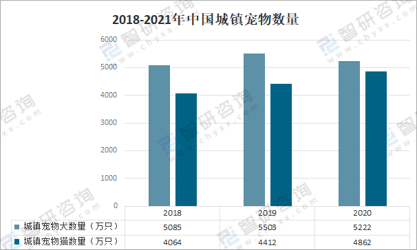 隨著社會的發展,國民經濟的持續增長和人民生活水平的不斷提高,在物質生活極大豐富的同時,人們對于精神生活 的追求也到了一定的高度。一方面,人們越來越注重培養生活情趣和追求個性化體驗,另一方面,傳統家庭結構的改變和工 作壓力的增大,使越來越多的人將感情投注于寵物身上,寵物行業由此逐漸發展起來。2020年中國城鎮寵物犬數量為5222萬只,同比下降5.1%;城鎮寵物貓數量為4862萬只,同比增長10.2%。