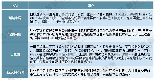 國內從事IGBT研發、生產及銷售的公司包括斯達半導、宏微科技、士蘭微及比亞迪半導體以等。其中,斯達半導、宏微科技主要以IGBT產品為主營業務;士蘭微是國內IDM模式龍頭,主營業務除IGBT外還包含集成電路和發光二極管;比亞迪半導體以車規級半導體為核心,主營業務除IGBT外還包含智能傳感器、光電半導體和智能IC。