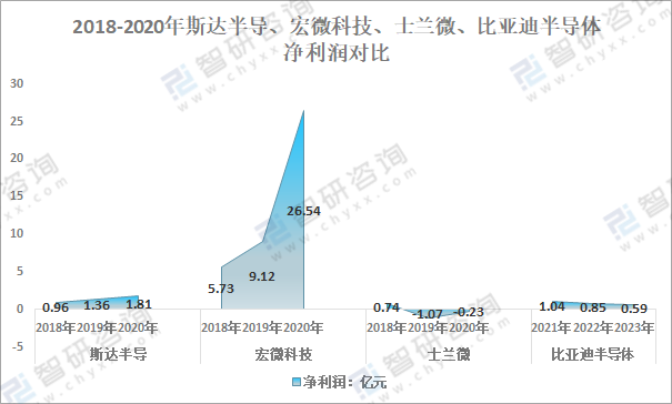 2018-2020年斯達半導、宏微科技、士蘭微、比亞迪半導體凈利潤對比