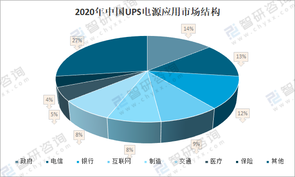 中國UPS電源應用市場廣闊,2020年在中國UPS電源應用市場中政府部門占14%;電信領域占13%;銀行領域占12%;互聯網領域占9%;制造、交通領域各占8%;醫療領域占5%;保險領域占4%。