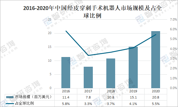 2016-2020年中國經(jīng)皮穿刺手術(shù)機器人市場規(guī)模及占全球比例