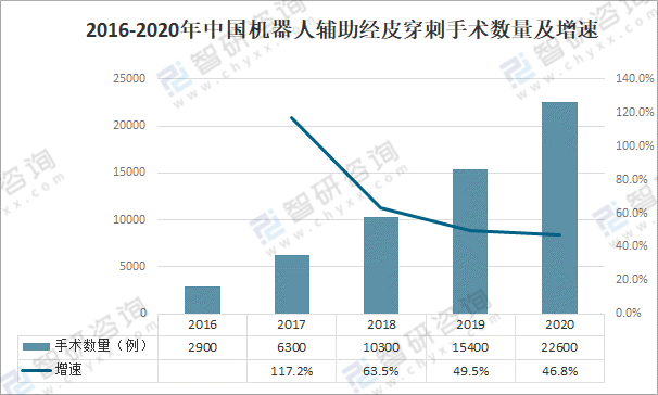 2016-2020年中國機器人輔助經(jīng)皮穿刺手術(shù)數(shù)量及增速