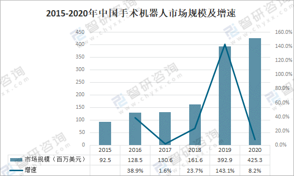 2015-2020年中國手術(shù)機器人市場規(guī)模及增速