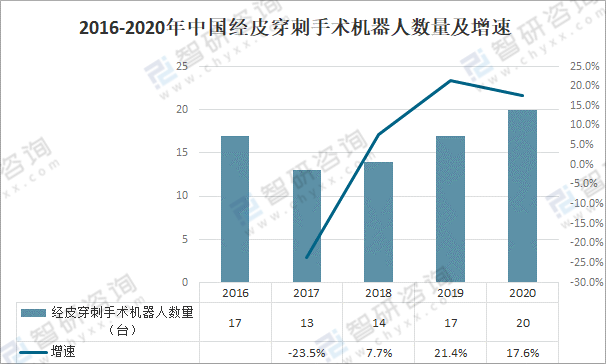 2016-2020年中國經(jīng)皮穿刺手術(shù)機器人數(shù)量及增速