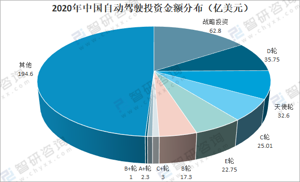 從自動駕駛投資金額分布來看,其中戰(zhàn)略投資規(guī)模為62.8億美元,D輪投資規(guī)模為35.75億美元,天使輪投資規(guī)模為32.6億美元,C輪投資規(guī)模為25.01億美元。