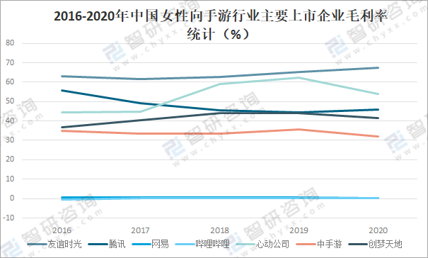2016-2020年中國女性向手游行業主要上市企業毛利率統計(%)