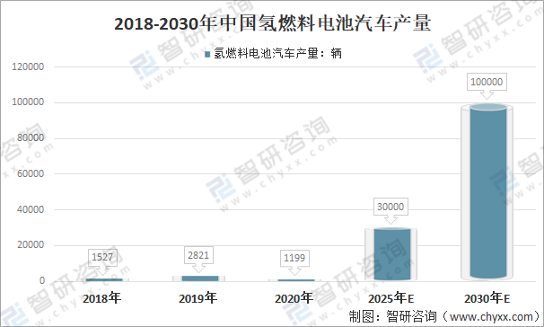目前的汽車可以說是從傳統汽車向純電動汽車的演變,也就是汽車動力來源的變化,作為最大的潛在氫燃料電池汽車消費市場之一,我國已掌握部分氫能基礎設施與一批燃料電池相關技術,具備一定的產業裝備及燃料電池整車的生產能力。2018年,我國氫燃料電池汽車產量1527輛,車型以客車和物流車為主;2019年,我國氫燃料電池汽車產量2821輛;2020年4月,財政部等四部委發布《關于調整完善新能源汽車補貼政策的通知》,推出“以獎代補”政策,在技術要求、運營要求、補貼車型等不明確的情況下,地方政府與企業普遍傾向于等待具體補貼政策出臺,再以此調整生產計劃,疊加新冠肺炎疫情的沖擊,我國2020年氫燃料電池汽車產銷量大幅下滑。2020年,我國氫燃料電池汽車產量為1199輛下降57.5%。在政府大力支持、技術創新加速、基礎設施不斷完善以及資本迅速涌入的大背景下,中國氫燃料電池汽車行業爆發在即,預計2025年產量規模將突破3萬輛,同時,燃料電池技術也有望實現突破,成本大幅下降。到2030年,中國氫燃料電池汽車產銷量預計將達到數十萬輛。