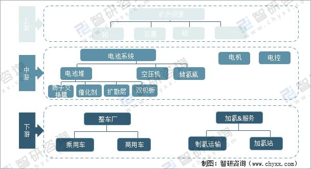 燃料電池汽車產業鏈上游是鉑、石墨、硫等礦產資源;中游是由燃料電池動力系統及關鍵部件;下游是整車廠及加氫&服務。