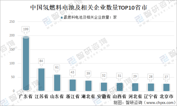 其中:廣東省有氫燃料電池及相關企業數量199家,位居全國第一,第二是江蘇省,有氫燃料電池及相關企業數量84家;第三是山東省,氫燃料電池及相關企業數量61家。