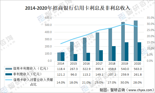 2014-2020年招商銀行信用卡利息及非利息收入