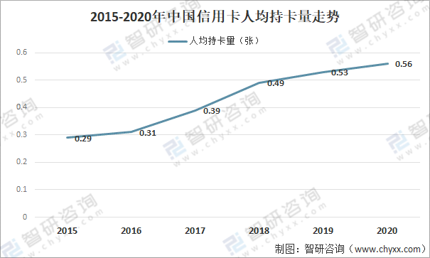 從人均持卡量角度來看,2020年我國人均持有信用和借貸合一卡0.56張,我國信用卡行業(yè)發(fā)展依然存在較大空間。
