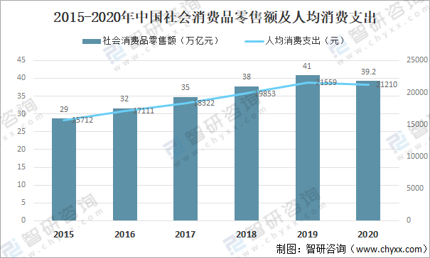 據(jù)國家統(tǒng)計局數(shù)據(jù),社會消費品零售額及人均消費支出逐年增加,其中2020年中國社會消費品零售額為39.2萬億元,同比下降3.9%;人均消費支出為1210元,同比下降1.6%。