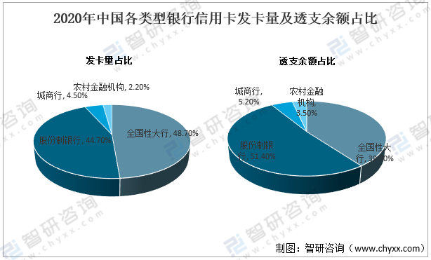 2020年中國各類型銀行信用卡發(fā)卡量及透支余額占比