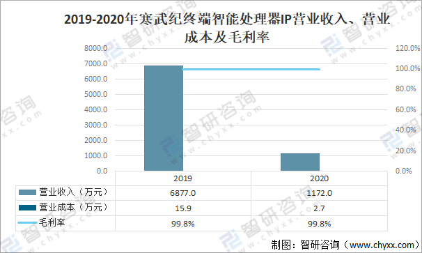 其中2020年寒武紀終端智能處理器IP營業收入為1172萬元,同比下降83%;終端智能處理器IP營業成本為2.7萬元,同比下降83.3%;毛利率為99.8%。