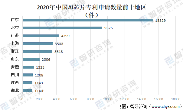 其中2020年中國AI芯片專利申請數量最多地區為廣東15329件;其次是北京地區AI芯片專利申請數量為9375件;再次是江蘇地區AI地區芯片專利申請量為4299件。