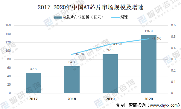 當前人工智能應用的興起,則對處理器芯片提出了新的設計架構要求,給芯片設計行業帶來了新的發展機遇。在這次變革中,傳統芯片企業和新興芯片設計企業站在了同一起跑線上,兩者各具優勢,都面臨著廣闊的市場機遇。2020年中國AI芯片市場規模為136.8億元,同比增長48.2%。