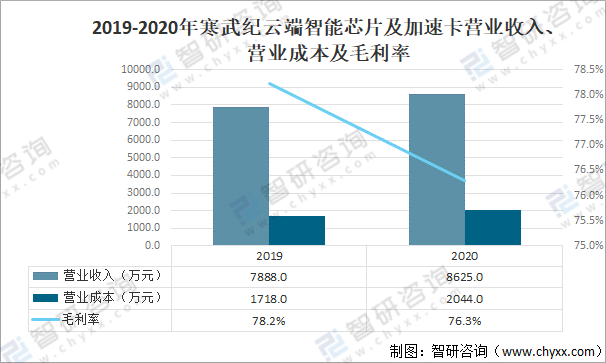 其中2020年寒武紀云端智能芯片及加速卡營業收入為8625萬元,同比增長9.3%;云端智能芯片及加速卡營業成本為2044萬元,同比增長19%;毛利率為76.3%。