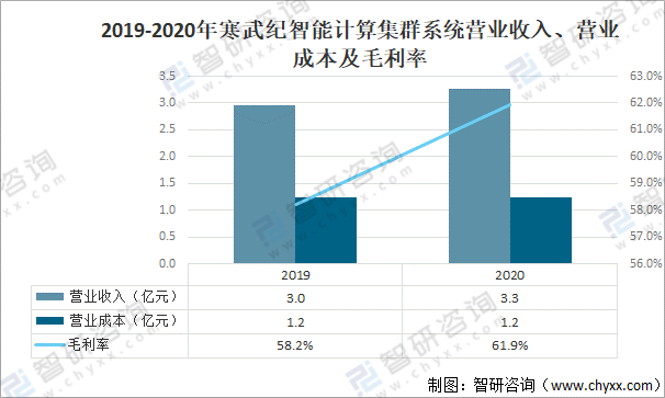 其中2020年寒武紀智能計算集群系統營業收入為3.3億元,同比增長10%;智能計算集群系統營業成本為1.2億元;毛利率為61.9%。