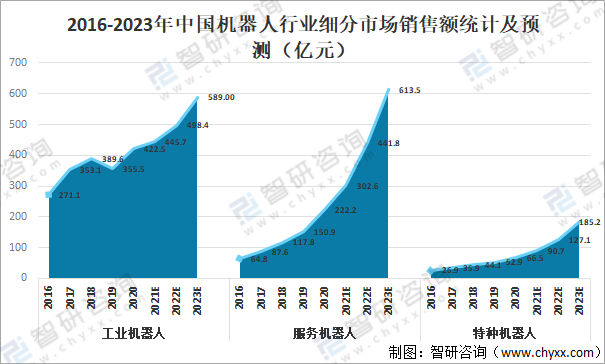 2016-2023年中國機器人行業細分市場銷售額統計及預測(億元)