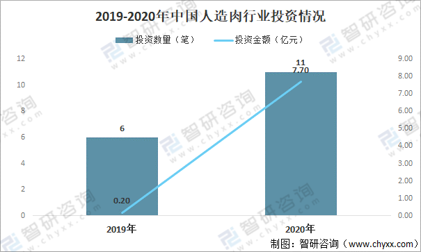 自2019年起,人造肉特別是植物性人造肉在技術和市場的雙重推動下快速發展,隨著人造肉在消費者中接受度的提高、人造肉技術的突破以及大規模生產帶來的人造肉生產成本的持續下降,行業投資熱度持續升溫。2020年中國人造肉行業投資數量達11筆,投資規模達7.70億元,單筆投資金額較2019年也有所擴大。
