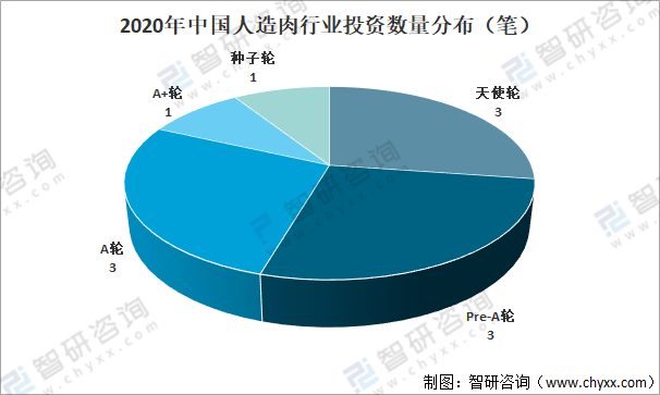從人造肉行業投資數量輪次分布來看,主要集中在天使輪、Pre-A輪、A輪,各有3筆;A+輪、種子輪各有1筆。