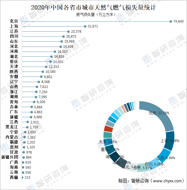 2020年中國各省市城市天然氣燃氣損失量統計