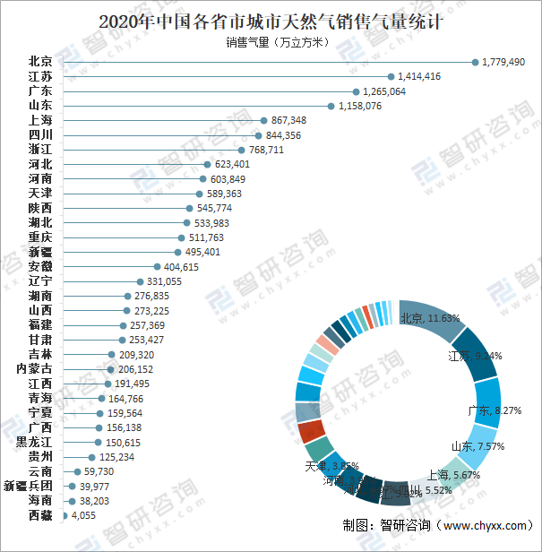 從銷售氣量來看,2020年全國城市天然氣銷售氣量共計15302771.08萬立方米,其中北京城市天然氣銷售氣量為1779490.00萬立方米,占全國城市天然氣銷售氣量的11.63%,占比最大;江蘇城市天然氣銷售氣量為1414415.74萬立方米,占全國城市天然氣銷售氣量的9.24%;廣東城市天然氣銷售氣量為1265063.83萬立方米,占全國城市天然氣銷售氣量的8.27%;山東城市天然氣銷售氣量為1158075.90萬立方米,占全國城市天然氣銷售氣量的7.57%;上海城市天然氣銷售氣量為867347.96萬立方米,占全國城市天然氣銷售氣量的5.67%。