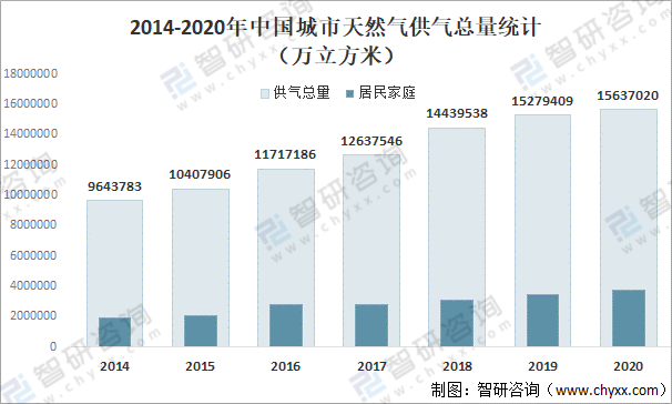 近年來中國城市天然氣供氣總量快速增長,2020年中國城市天然氣供氣總量達15637020萬立方米,較2019年增加了357610.31萬立方米,同比增長2.34%,其中城市居民家庭天然氣供氣總量為3815984萬立方米。