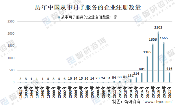 隨著我國 “二孩、”“三孩”政策的實施,對月子服務巨大的市場需求,中國從事月子服務的企業注冊數量增長明顯,2020年中國從事月子服務的企業注冊數量1665家,由于疫情的影響,較2019年減少437家;截止2021年11月17日,中國從事月子服務的企業注冊數量416家。