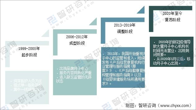 經過近二十年的發展,月子中心以其專業性與系統性獲得廣大消費者認可。我國月子中心發展經歷了起步階段、成型階段、調整階段及2020年以來在新冠疫情環境下的復蘇階段。