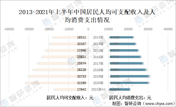 2013-2021年上半年中國居民人均可支配收入及人均消費支出情況
