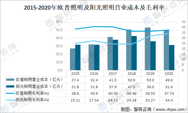 其中2020年歐普照明營業成本為49.6億元,同比下降6.4%,毛利率為37.74%;陽光照明營業成本為31.6億元,同比下降12.2%,毛利率為34.4%。