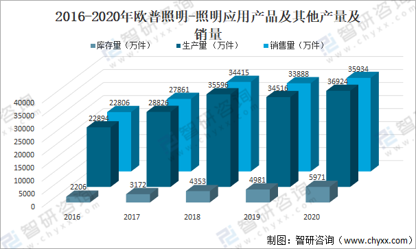 其中2020年歐普照明-照明應用產品及其他產量為36924萬件,同比增長7%;照明應用產品及其他銷量為35934萬件,同比增長6%。