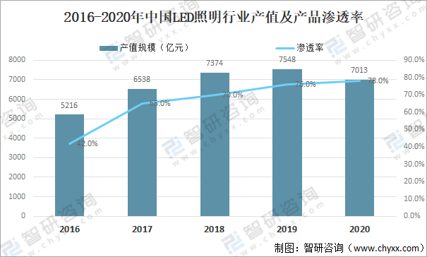 2016-2020年中國LED照明行業產值及產品滲透率