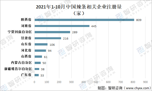 其中2021年1-10月中國辣條企業(yè)注冊數(shù)量最多的地區(qū)為陜西省809家;其次是河南省辣條相關(guān)企業(yè)注冊量445家。