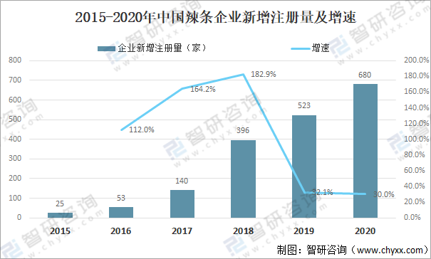 隨著辣條食品的火熱,近幾年辣條企業(yè)新增注冊量數(shù)量增加,2020年中國辣條企業(yè)新增注冊量為680家,同比增長30%。