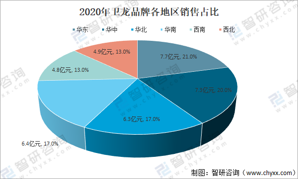 從衛(wèi)龍品牌各地區(qū)銷售來看,2020年衛(wèi)龍品牌銷售占比最高地區(qū)為華東地區(qū)7.7億元,占銷售比例的21%;其次是華中地區(qū)衛(wèi)龍品牌銷售7.3億元,占總銷售比例的20%。