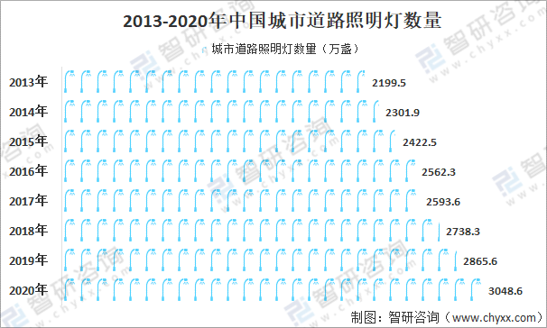 近十年來,隨著中國的城鎮(zhèn)化建設(shè)進(jìn)程加快,中國城市照明行業(yè)也保持較快的發(fā)展。根據(jù)住建部數(shù)據(jù):中國城市道路照明燈數(shù)量由2013年的2199.5萬盞增加至2020年的3048.6萬盞,其中近一半使用的LED燈,為LED行業(yè)發(fā)展提供了龐大的需求空間。