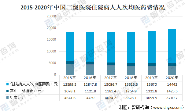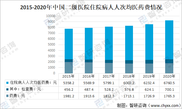 2020年中國二級醫(yī)院住院病人人次均醫(yī)藥費(fèi)6760.5元,較2019年增長528.1元,其中:藥費(fèi)1765.3元,占住院醫(yī)藥費(fèi)的26.1%;檢查費(fèi)700.1元,占住院醫(yī)藥費(fèi)的10.4%。