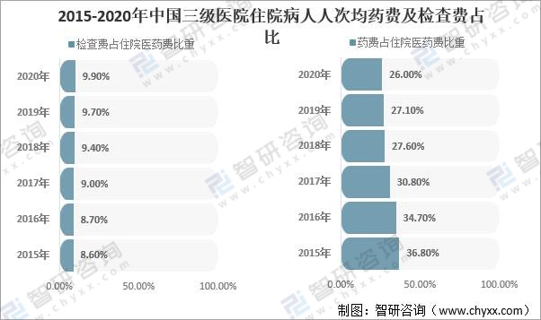 2015-2020年中國三級醫(yī)院住院病人人次均藥費(fèi)及檢查費(fèi)占比