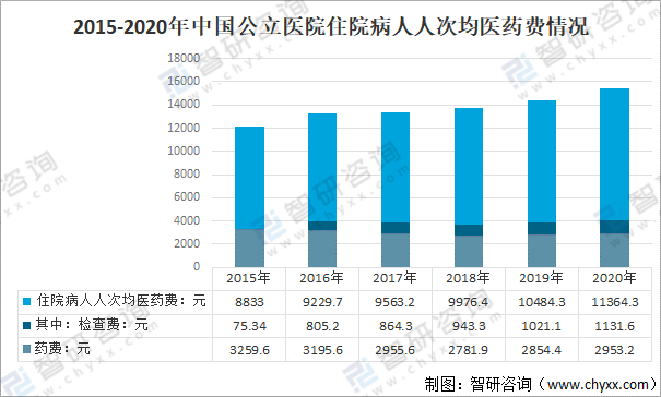 從公立醫(yī)院住院病人人次均醫(yī)藥費(fèi)來看,2020年中國公立醫(yī)院住院病人人次均醫(yī)藥費(fèi)11364.3元,較2019年增長880元,其中:藥費(fèi)2953.2元,占住院醫(yī)藥費(fèi)的26.0%;檢查費(fèi)1131.6元,占住院醫(yī)藥費(fèi)的10.0%。