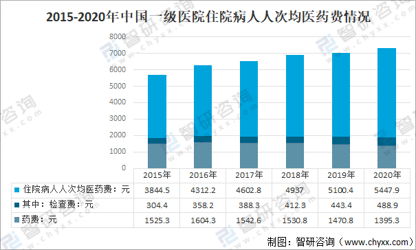 2020年中國一級醫(yī)院住院病人人次均醫(yī)藥費(fèi)5447.9元,較2019年增長347.5元,其中:藥費(fèi)1395.3元,占住院醫(yī)藥費(fèi)的25.6%;檢查費(fèi)488.9元,占住院醫(yī)藥費(fèi)的9.0%。