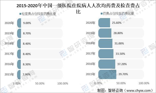 2015-2020年中國一級醫(yī)院住院病人人次均藥費(fèi)及檢查費(fèi)占比