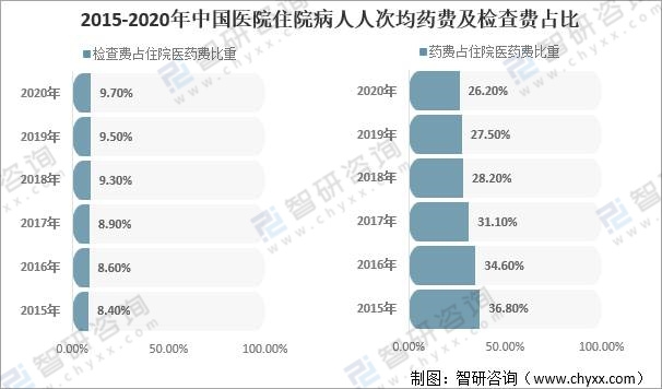 2015-2020年中國醫(yī)院住院病人人次均藥費(fèi)及檢查費(fèi)占比