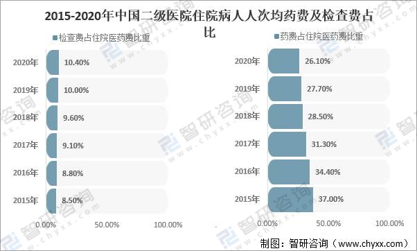 2015-2020年中國二級醫(yī)院住院病人人次均藥費(fèi)及檢查費(fèi)占比